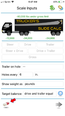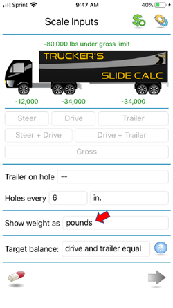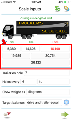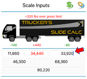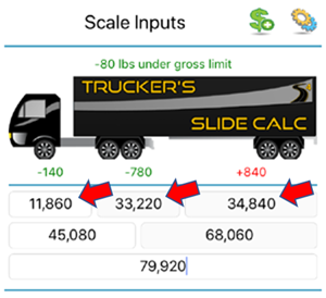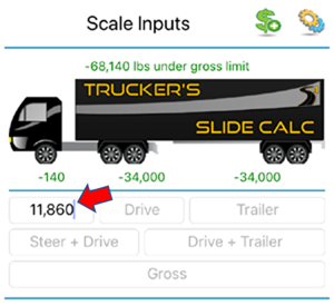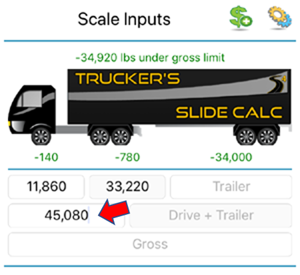 Note: The app also allows you to calculate axle-weights when pulling off a scale. To do so, start by measuring and entering your truck's "Gross" weight, then measure and enter the "Drive+Trailer" weight, last weight and enter the "Trailer" weight.